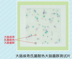 測試片上出現(xiàn)紫紅色或藍(lán)色菌斑都是耐熱大腸菌群陽性,其中藍(lán)色為大腸埃希氏菌陽性。沒有紫紅色或藍(lán)色斑點(diǎn)為陰性結(jié)果。